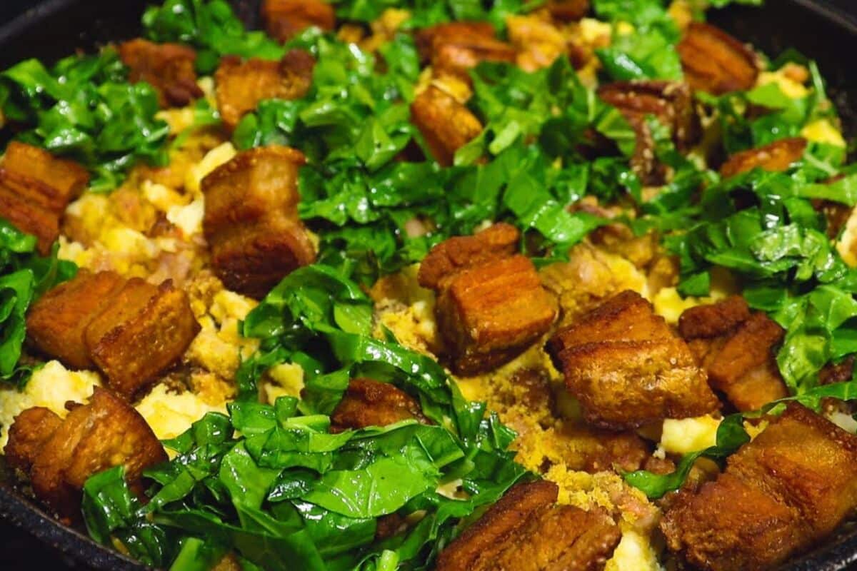 - Coloque os cubos de panceta sobre o feijão refogado, e finalize com a couve refogada.