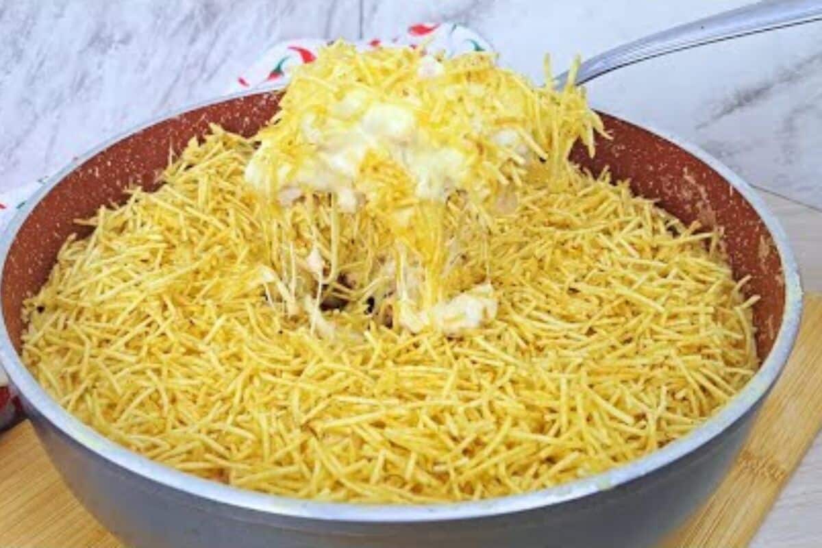 - Coloque a mussarela ralada, deixe derreter, finalize com batata palha e retiredo fogo.