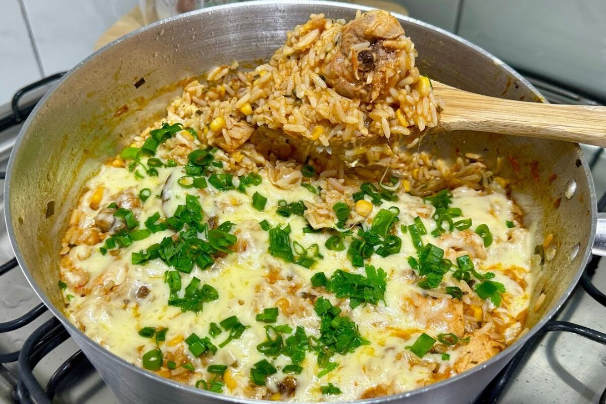 Para fazer galinhada completa vamos precisar de frango, milho verde em conserva, arroz cru, alho, tomate, cebola, óleo ou azeite, molho de tomate pronto, páprica defumada, orégano, louro, cebolinha, salsinha, sal, pimenta do reino e água fervente. Primeiramente iremos colocar os cortes de frango numa panela com óleo e em fogo médio e deixar fritar bem. Em seguida vamos acrescentar os demais ingredientes seguindo as instruções, até cozinhar totalmente o arroz e ficar cremoso. Iremos finalizar com mussarela ralada e cebolinha verde, deixar descansar por 5 minutos, e saborear cada colherada!