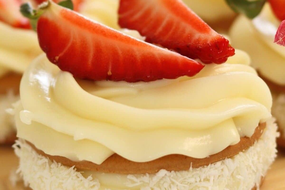 - Coloque o creme frio no saco de confeiteiro com bico de pitanga, pegue uma bolacha maria, coloque um pouco do creme fazendo uma roseta, coloque outra bolacha maria por cima formando um sanduíche, passe esse sanduíche na lateral no coco ralado, por cima faça mais uma roseta com o creme e decore com morangos cortados em meias luas. Faça esse processo com todas as bolachas maria.